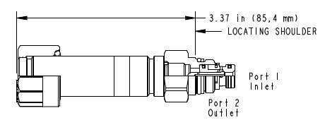 This 2-port, pilot-stage, direct-acting relief cartridge is an electro-proportionally controlled, pressure regulating valve. The proportional control allows for infinite, step-less adjustability within the selected pressure range. When the pressure at port 1 (inlet) is sufficient to overcome the solenoid forces, as determined by the analog input signal, the poppet lifts and allows flow from port 1 to port 2 (outlet). This pilot control cartridge utilizes the T-8A cavity so it can be used in conjunction with Sun’s main stage, pressure control elements.