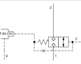 This is a normally closed, balanced poppet, switching element with an integral T-8A control cavity. With a 2-way valve in the closed position installed in the T-8A control cavity, the poppet remains closed. Opening the 2-way valve shifts the poppet to the open position, provided there is sufficient pressure at port 3.